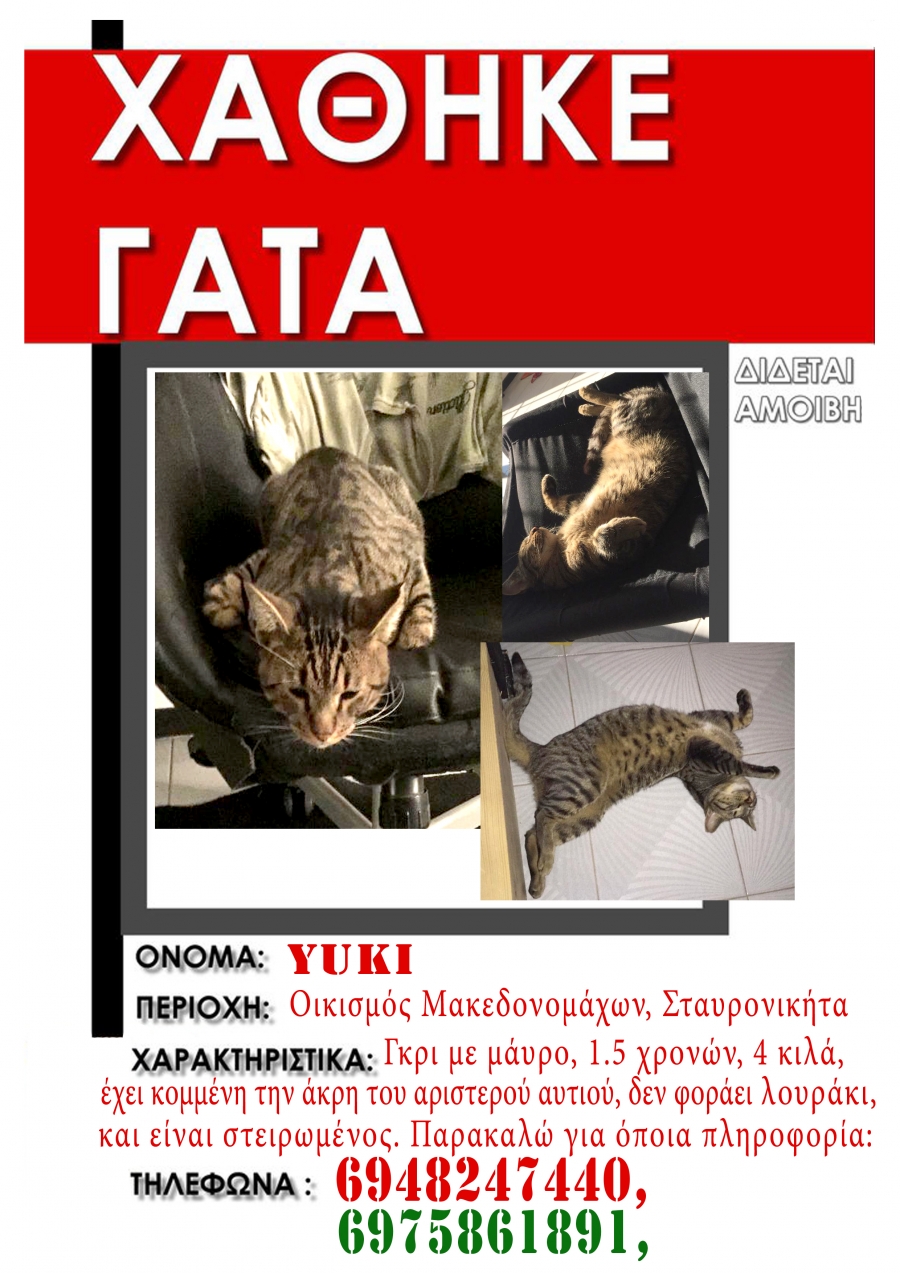 - Άλλες πληροφορίες: Χρωματος Μαυρο με γκρι, περιπου 4 κιλα, με κομμενη την ακρη του αριστερου αυτιου, στειρωμενος, χωρις λουρακι και με κιτρινοπα ματακια..